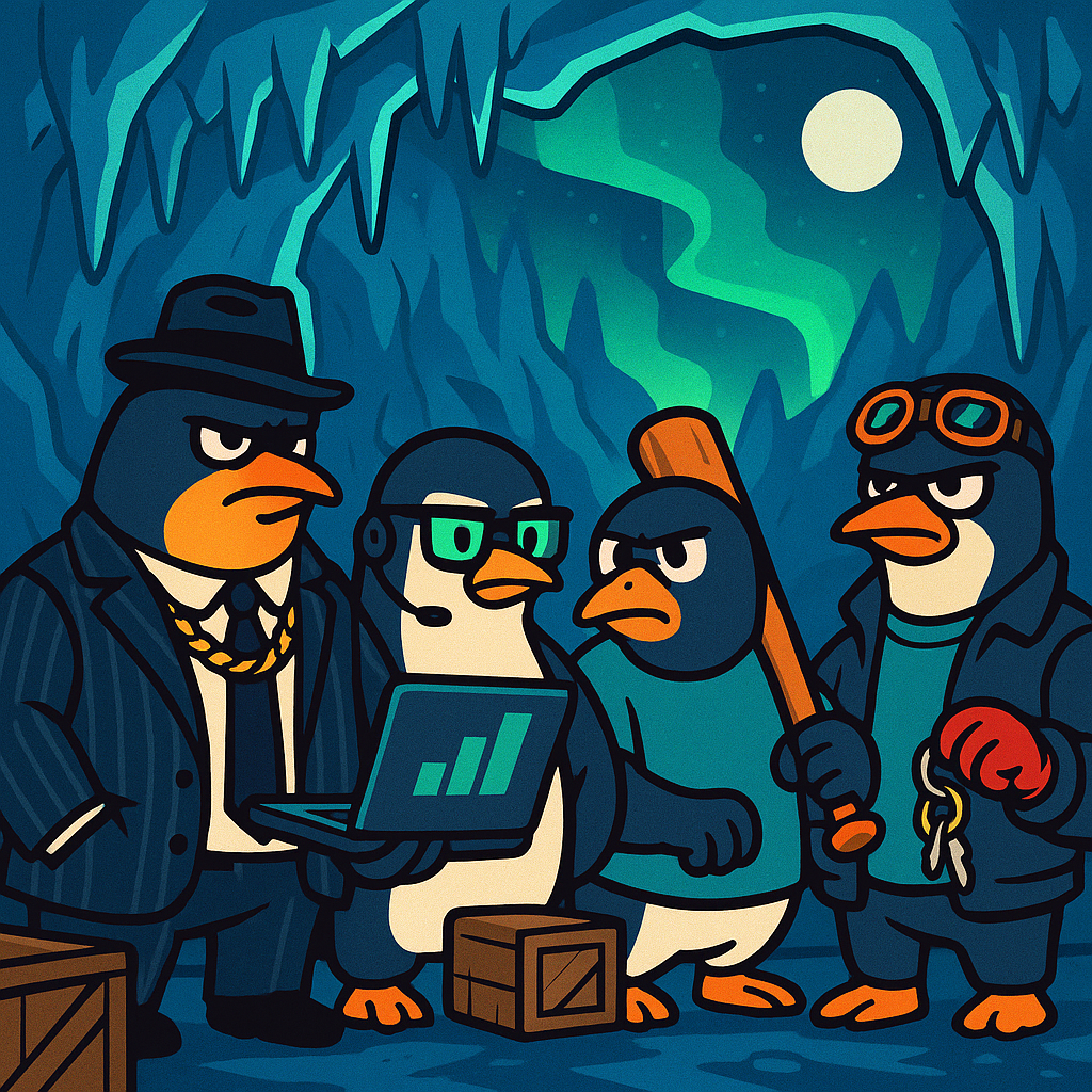 Cartel Penguins is the coolest crew on the ice—four tuxedoed troublemakers flipping fish and the meta. We meme, we waddle, we raid, we celebrate wins with icy giveaways and mini-games.